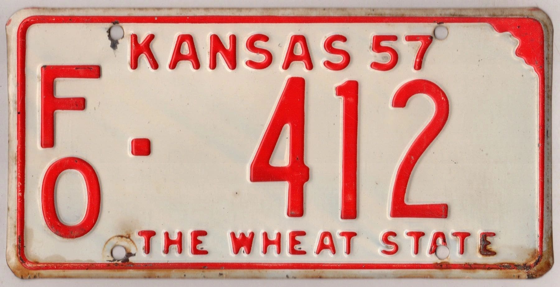 Kansas 1957 car license plate Ford county #FO-412