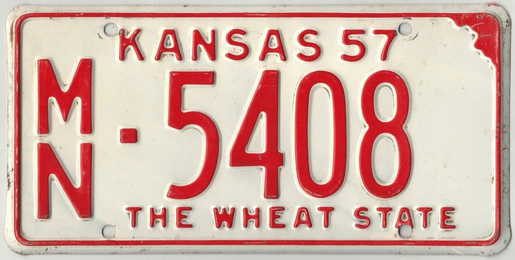 Kansas 1957 car license plate Marion county #MN-5408