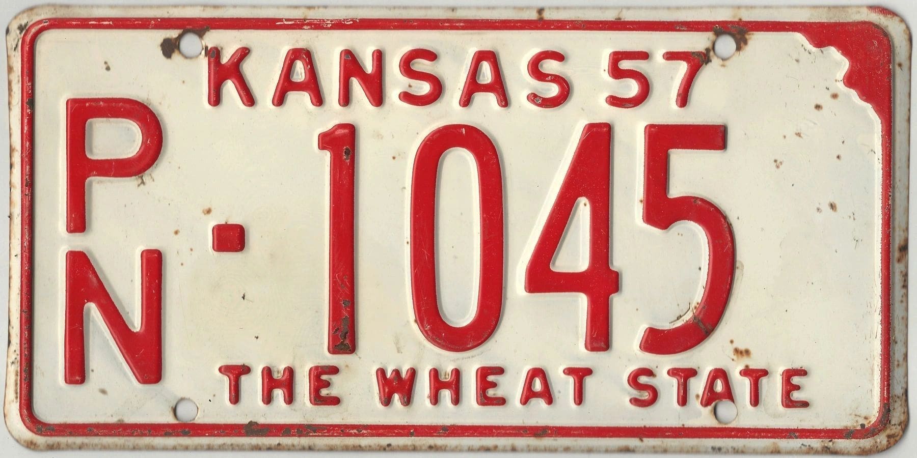 Kansas 1957 car license plate Pawnee county #PN-1045