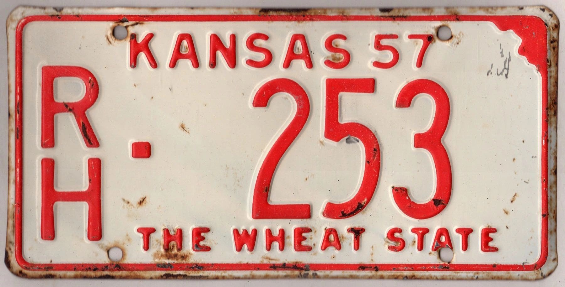 Kansas 1957 car license plate Rush county #RH-253