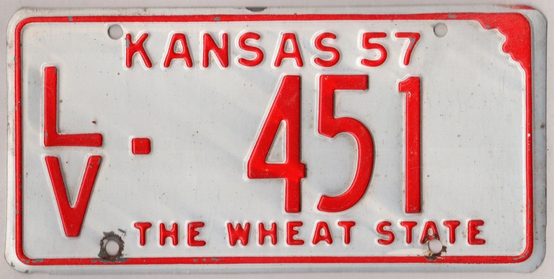 Kansas 1957 car license plate Leavenworth county #LV-451