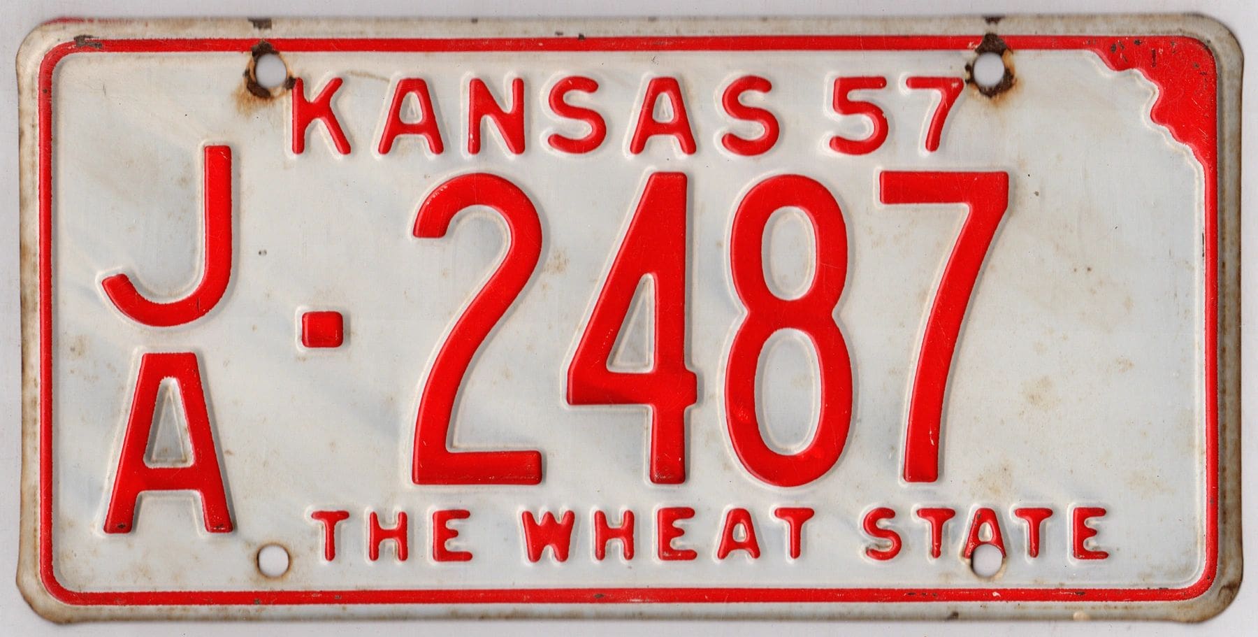 Kansas 1957 car license plate Jackson county #JA-2487
