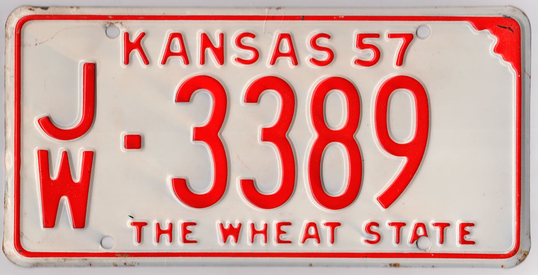 Kansas 1957 car license plate Jewell county #JW-3389