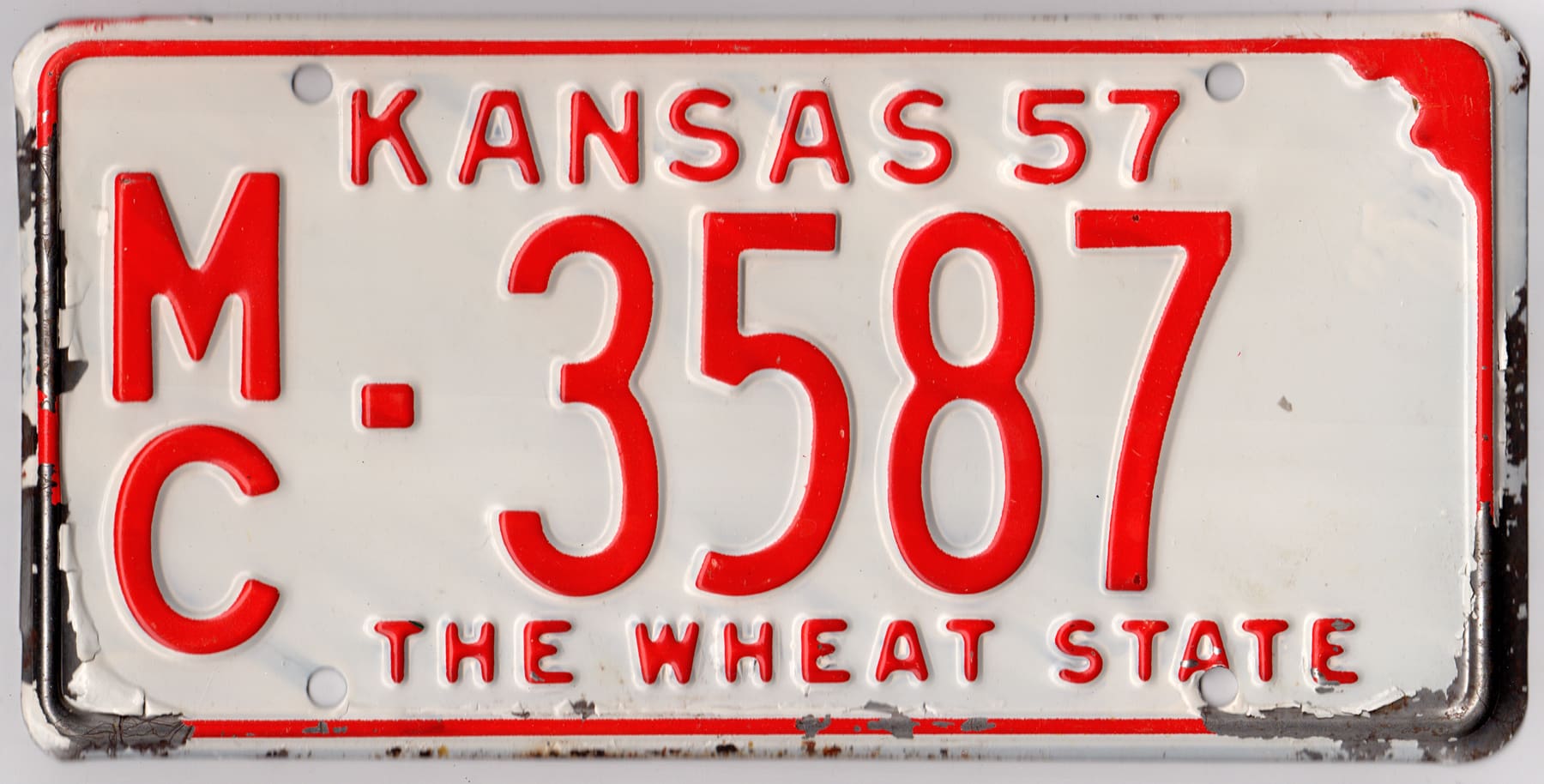 Kansas 1957 car license plate Mitchell county #MC-3587