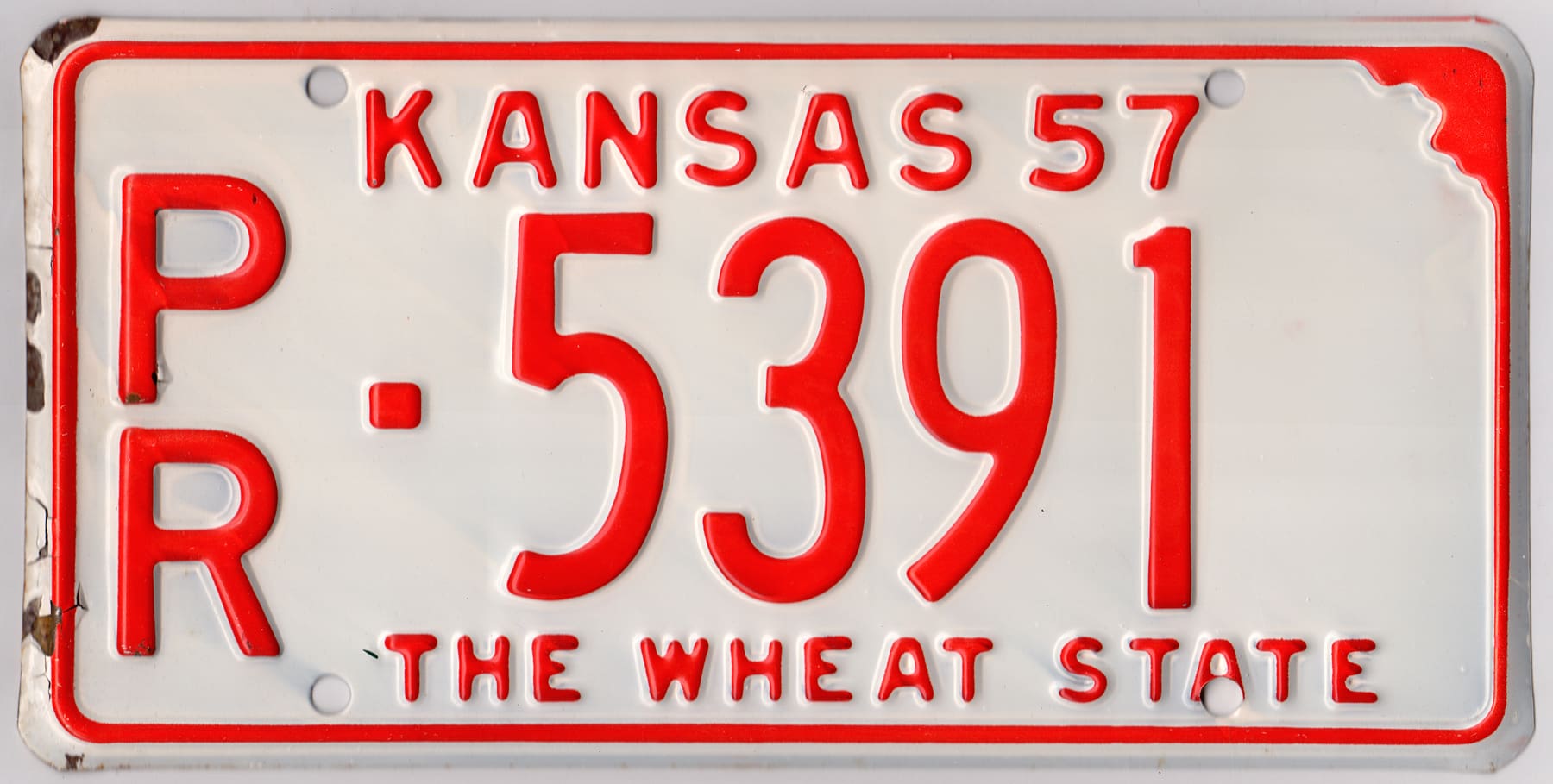 Kansas 1957 car license plate Pratt county #PR-5391