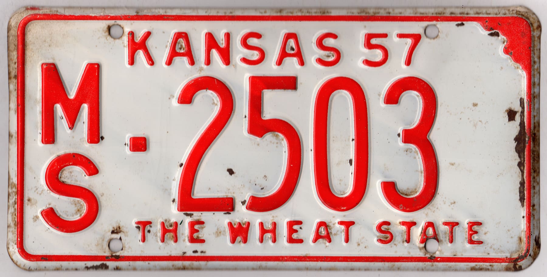 Kansas 1957 car license plate Marshall county #MS-2503
