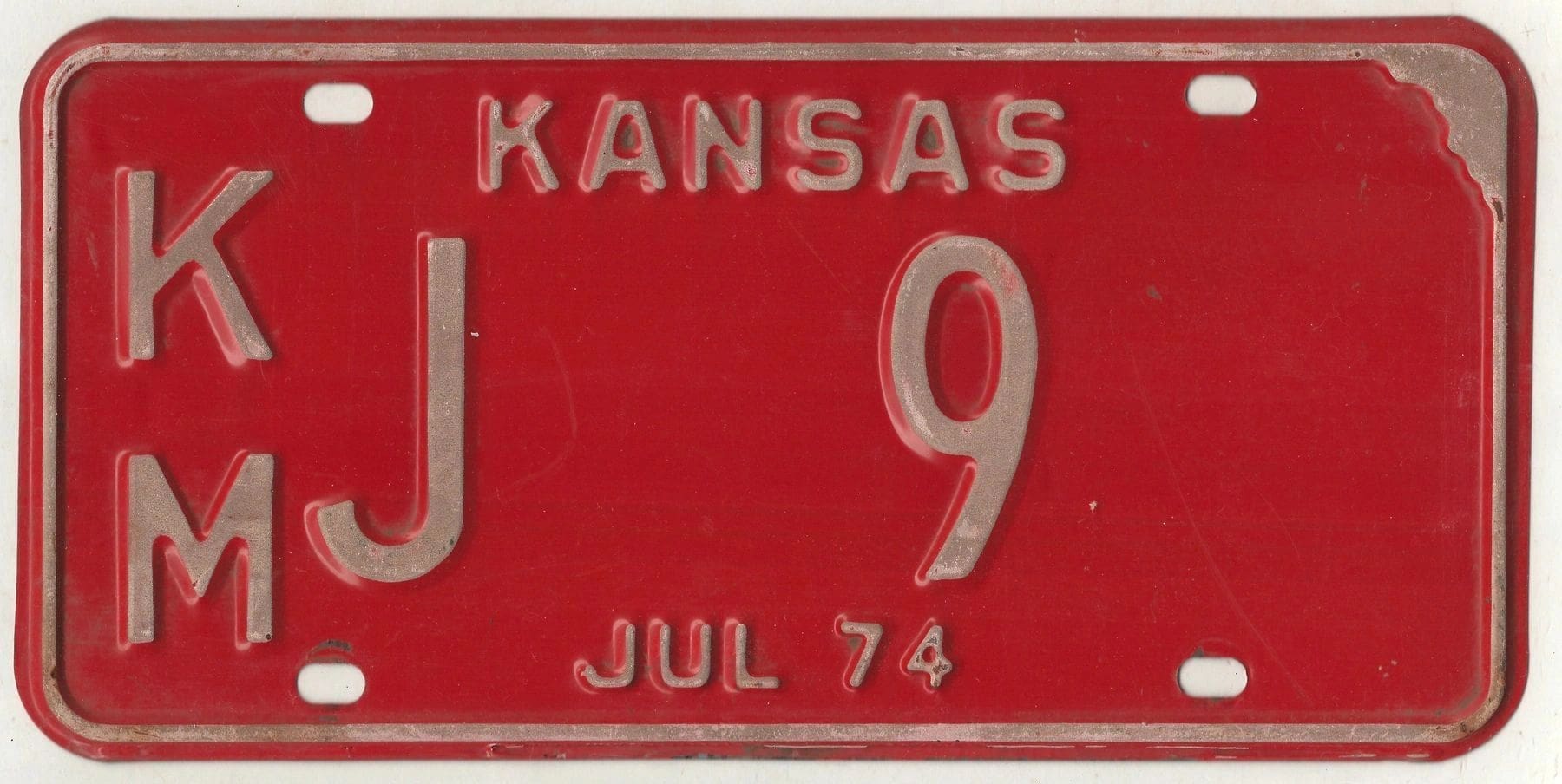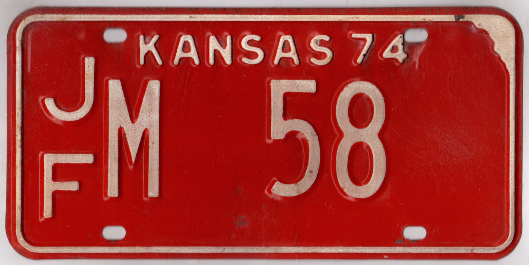 Kansas 1974 car license plate Jefferson county #JF M-58