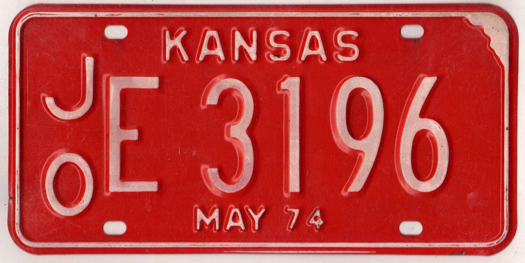 Kansas 1974 car license plate Johnson county #JO E-3196