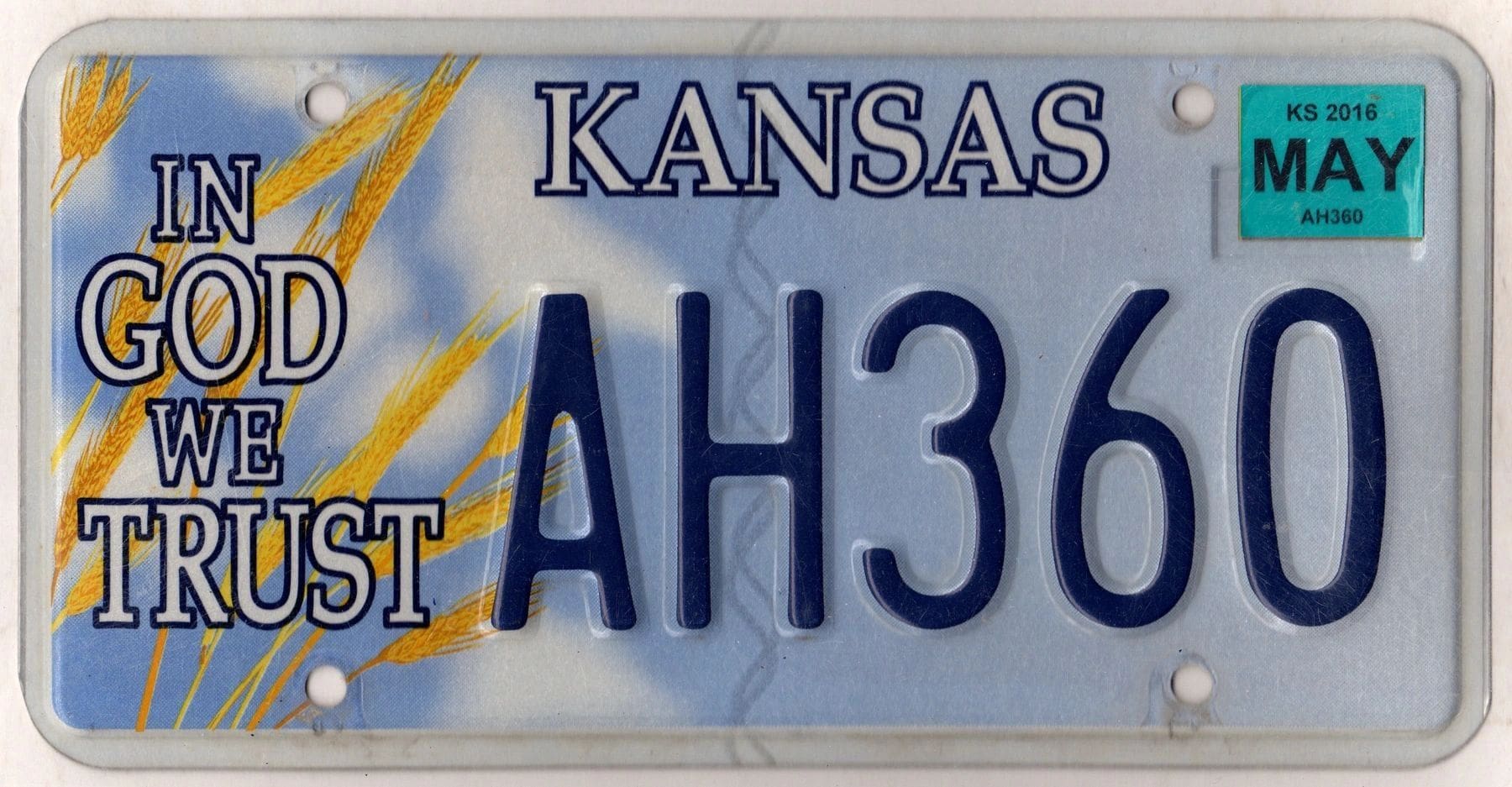 Kansas 2016 In God We Trust license plate #AH360