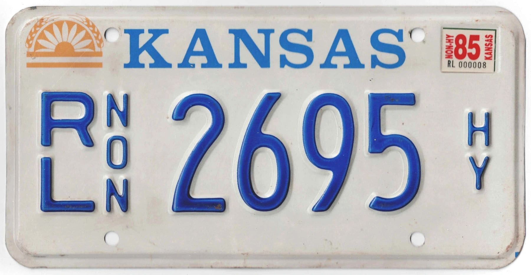Kansas 1985 non highway license plate Riley county #RL-2695