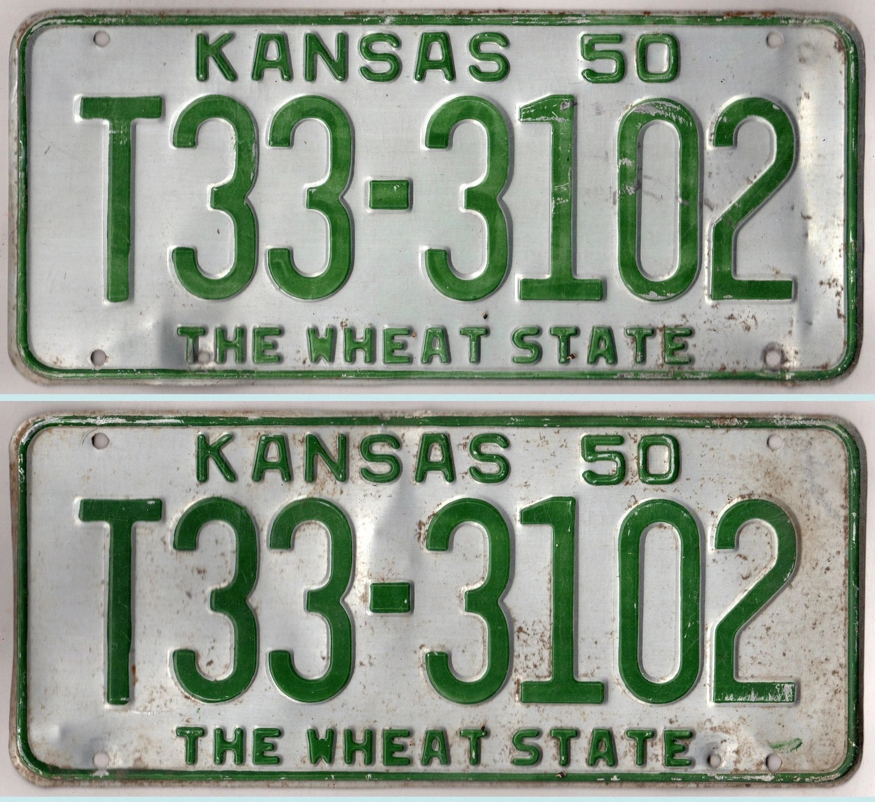 Kansas 1950 truck license plate pair Barton county #T33-3102