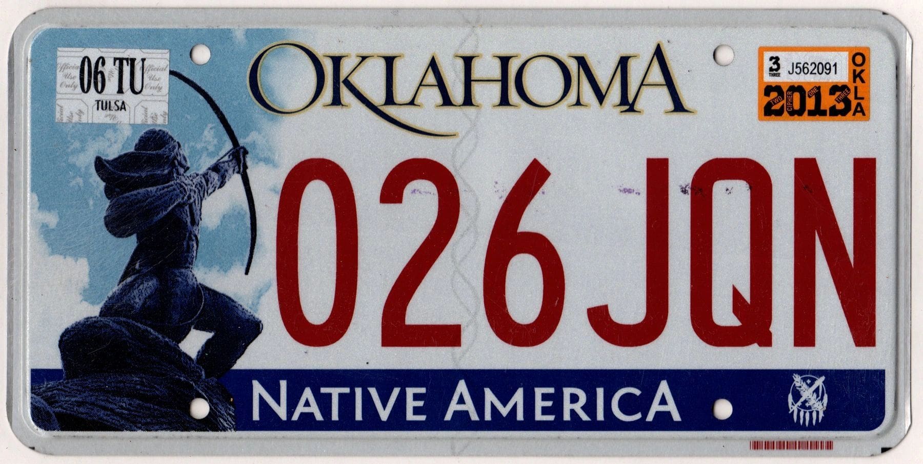 Oklahoma 2013 car license plate #026JQN