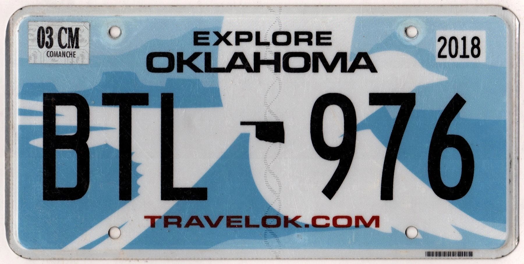 Oklahoma 2018 car license plate Comanche county #BTL-976