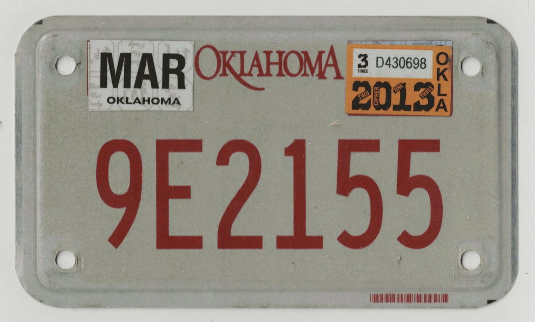 Oklahoma 2013 motorcycle license plate #9E2155