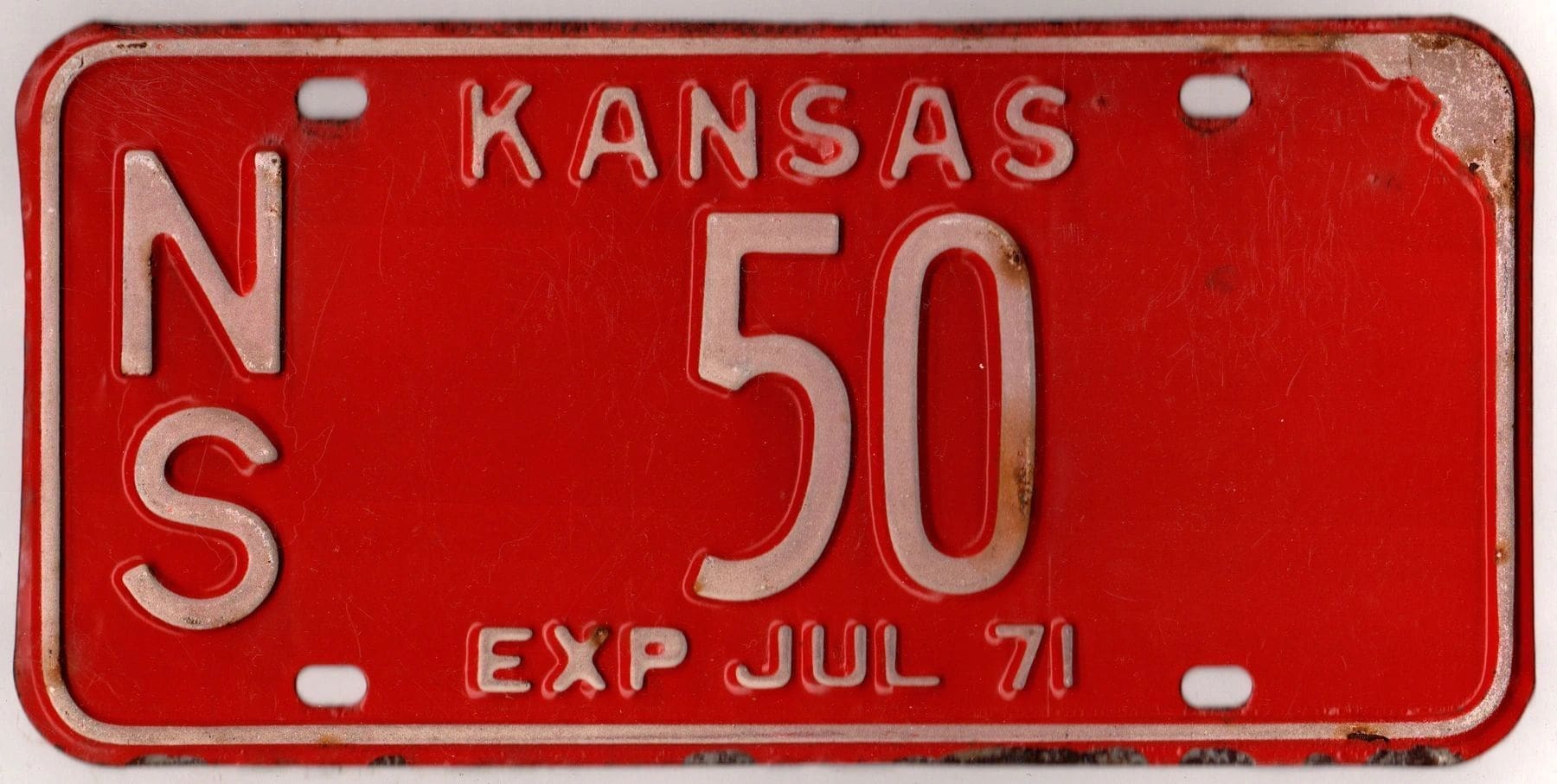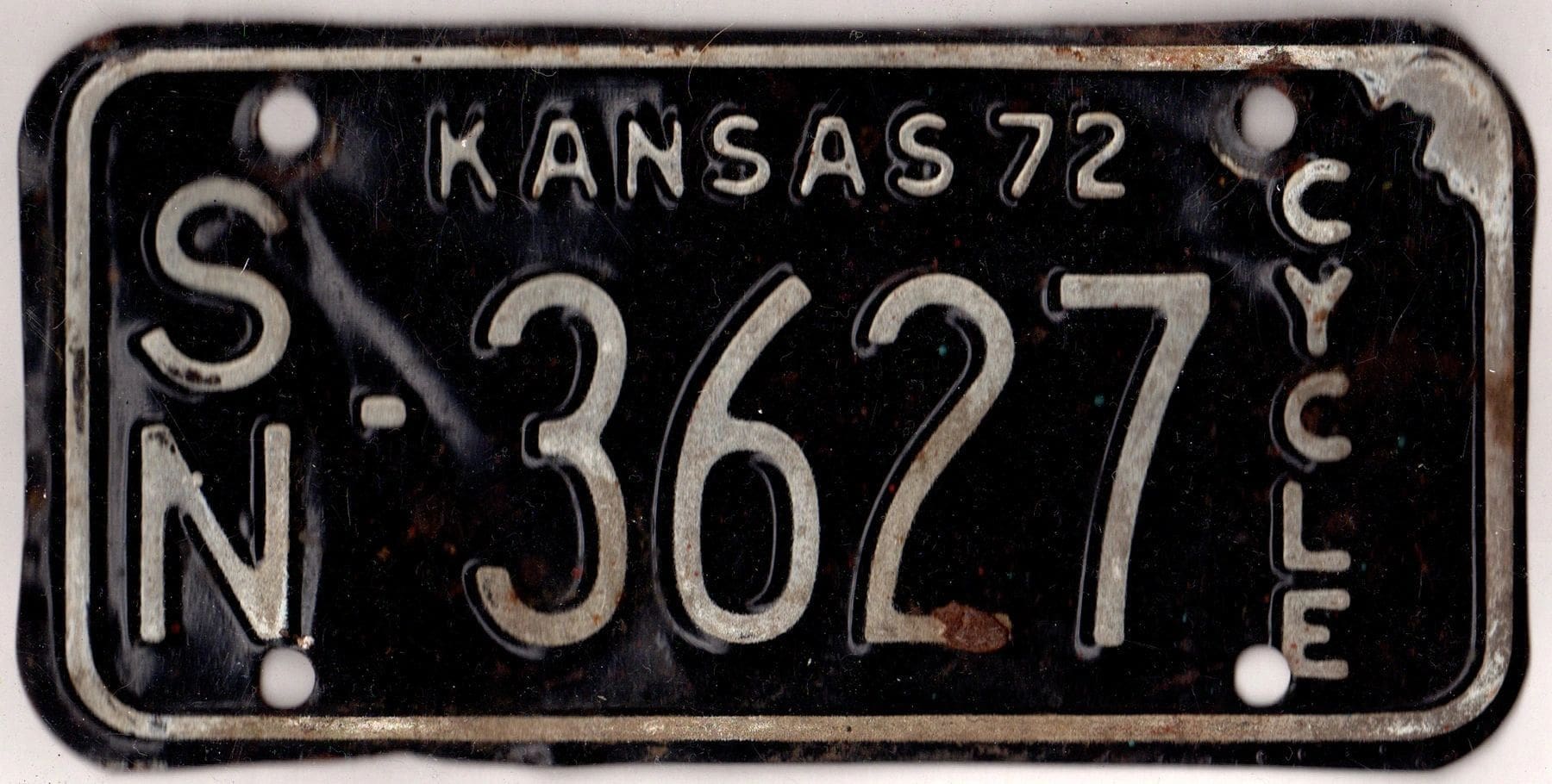 Kansas 1972 motorcycle license plate Shawnee county #SN-3627