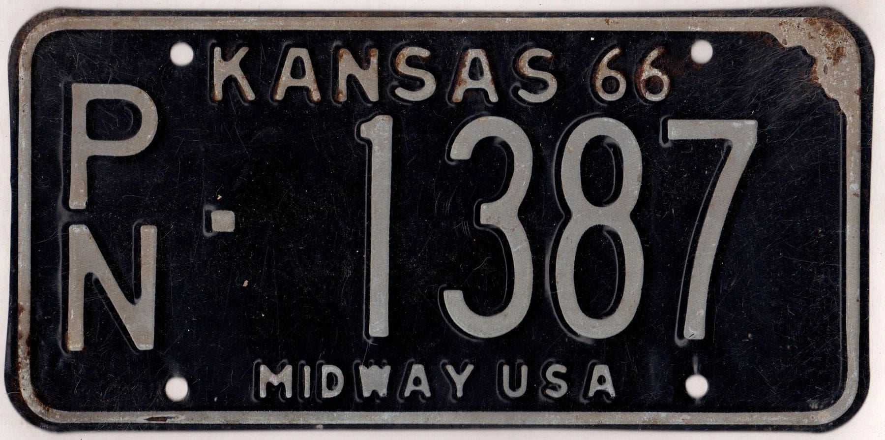 Kansas 1966 car license plate Pawnee county #PN-1387
