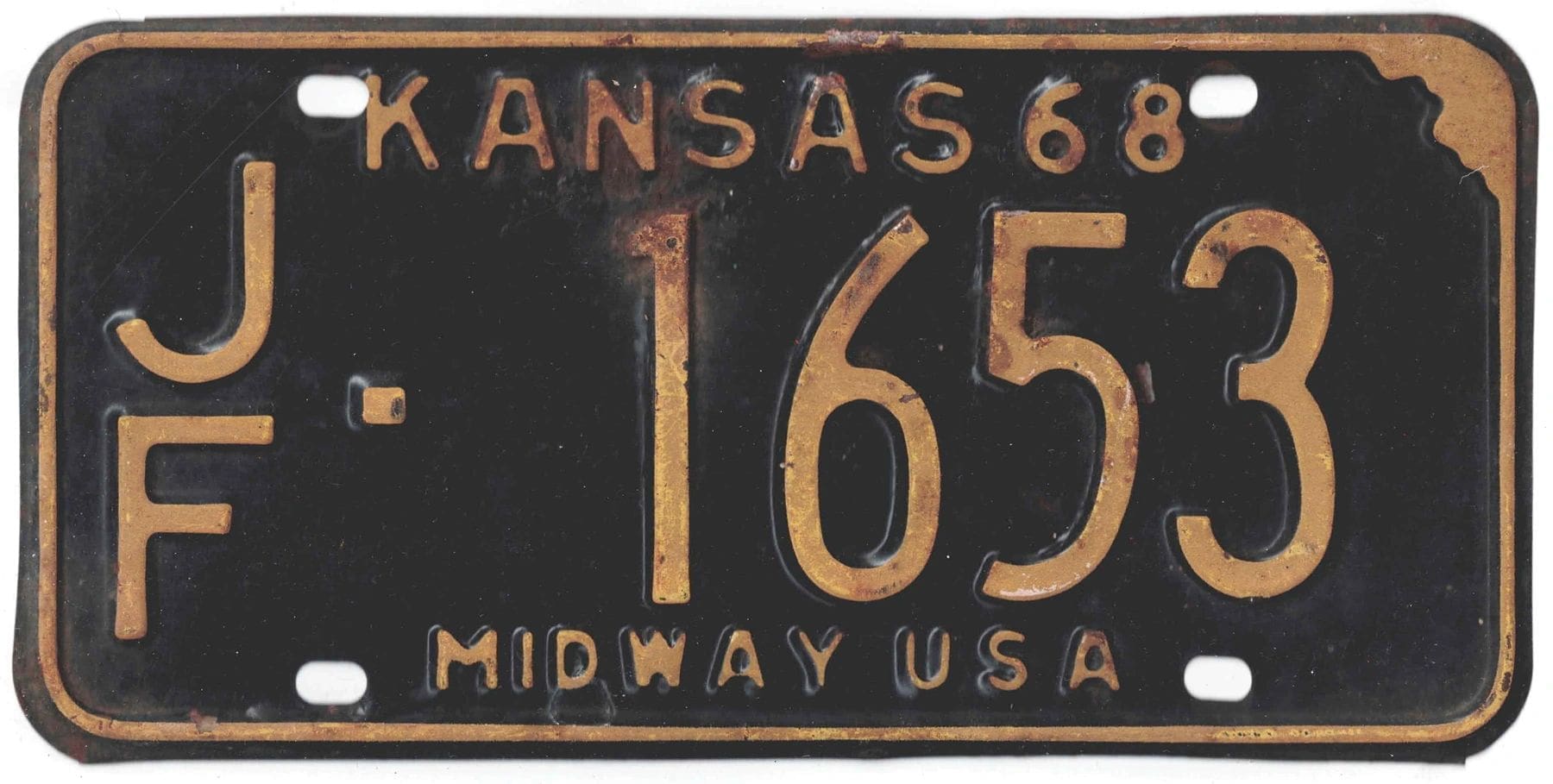 Kansas 1968 car license plate Jefferson county #JF-1653