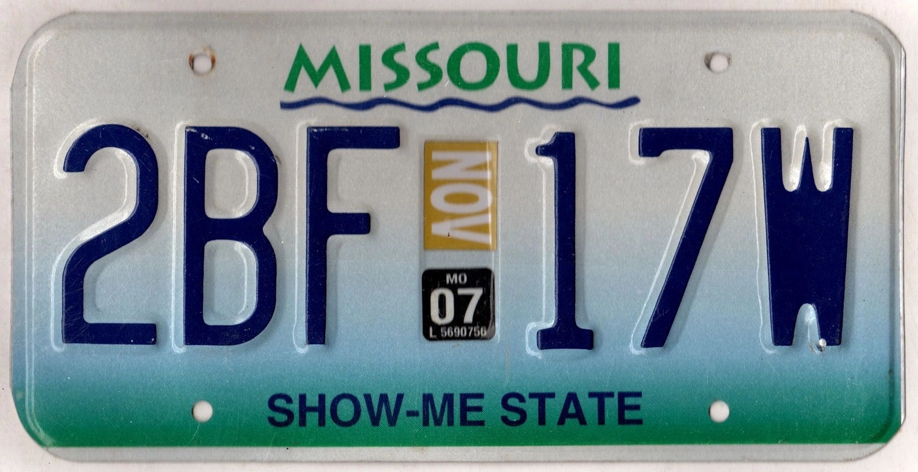 Missouri 2007 car license plate #2BF-17W