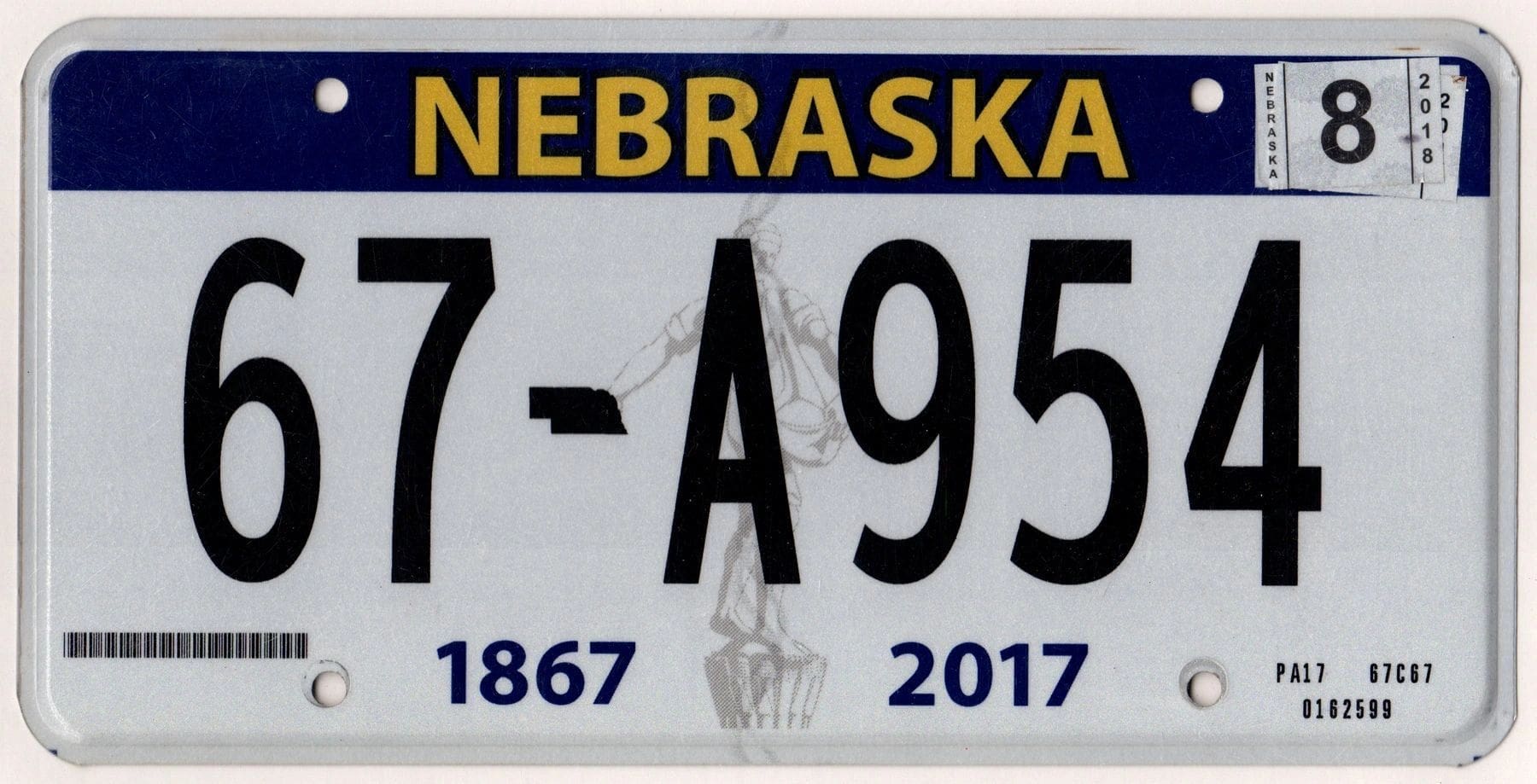 Nebraska 2018 car license plate Hitchcock county #67-A954