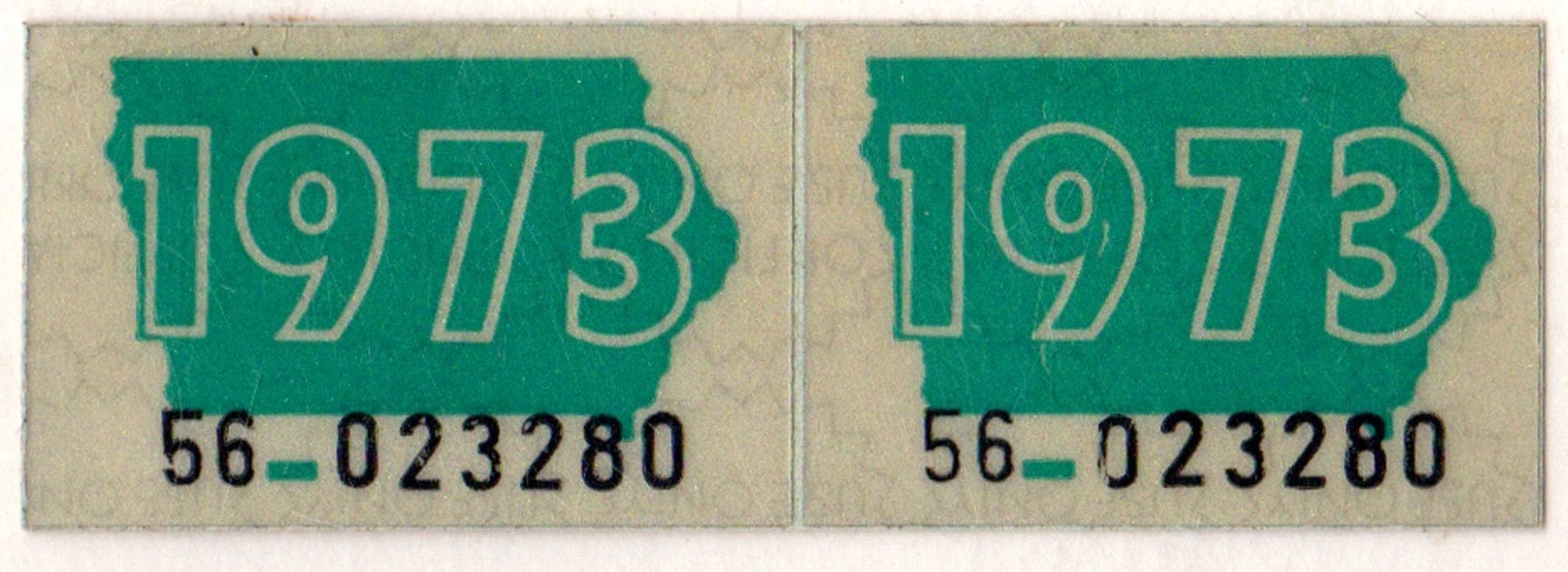 Iowa 1973 car license plate sticker pair Lee county #56-023280.