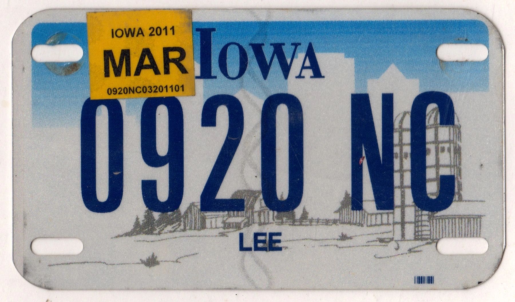 Iowa 2011 motorcycle license plate Lee county #0920 NC