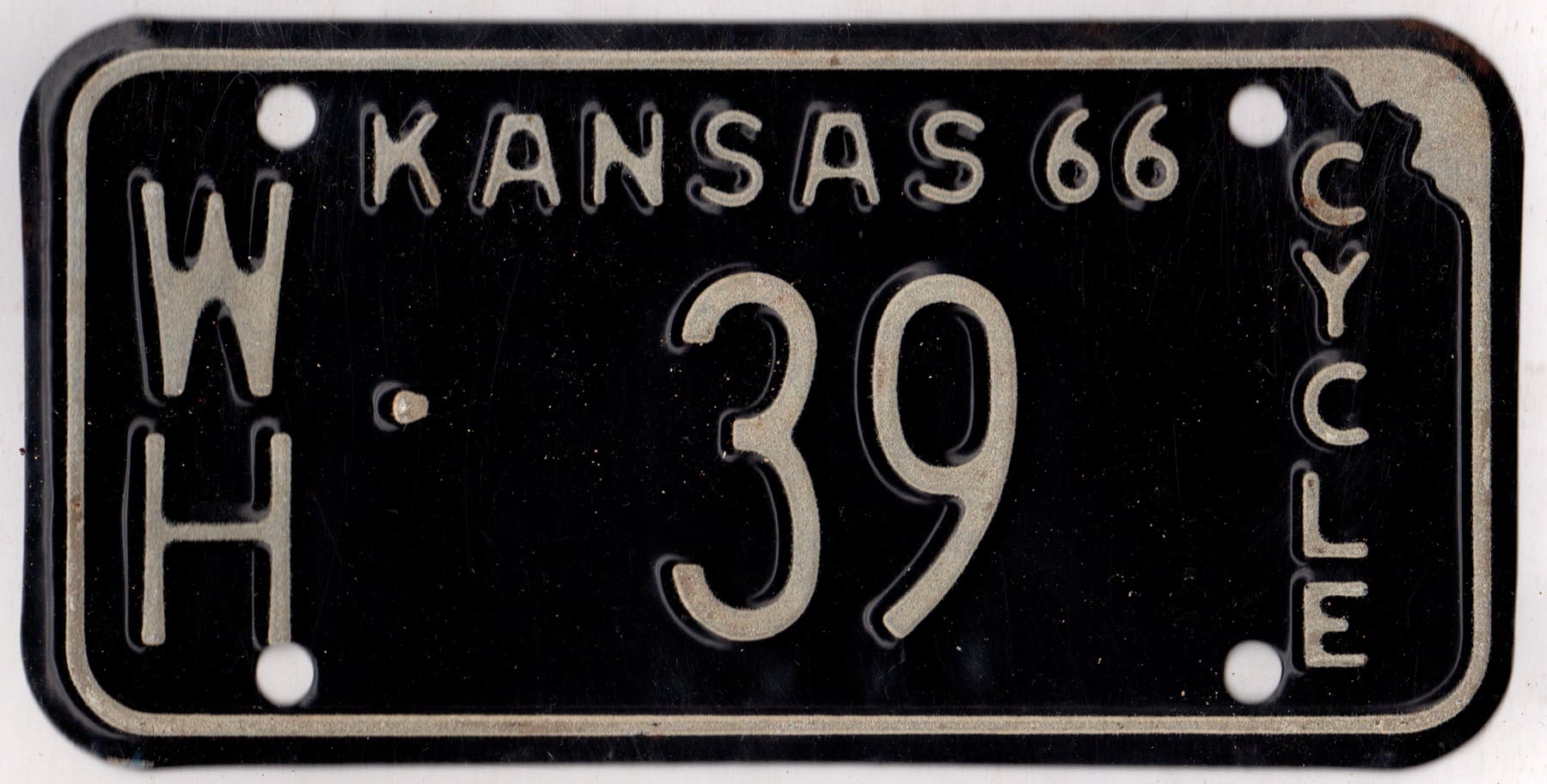 Kansas 1966 motorcycle license plate Wichita county #WH-39. This plate is NOS.