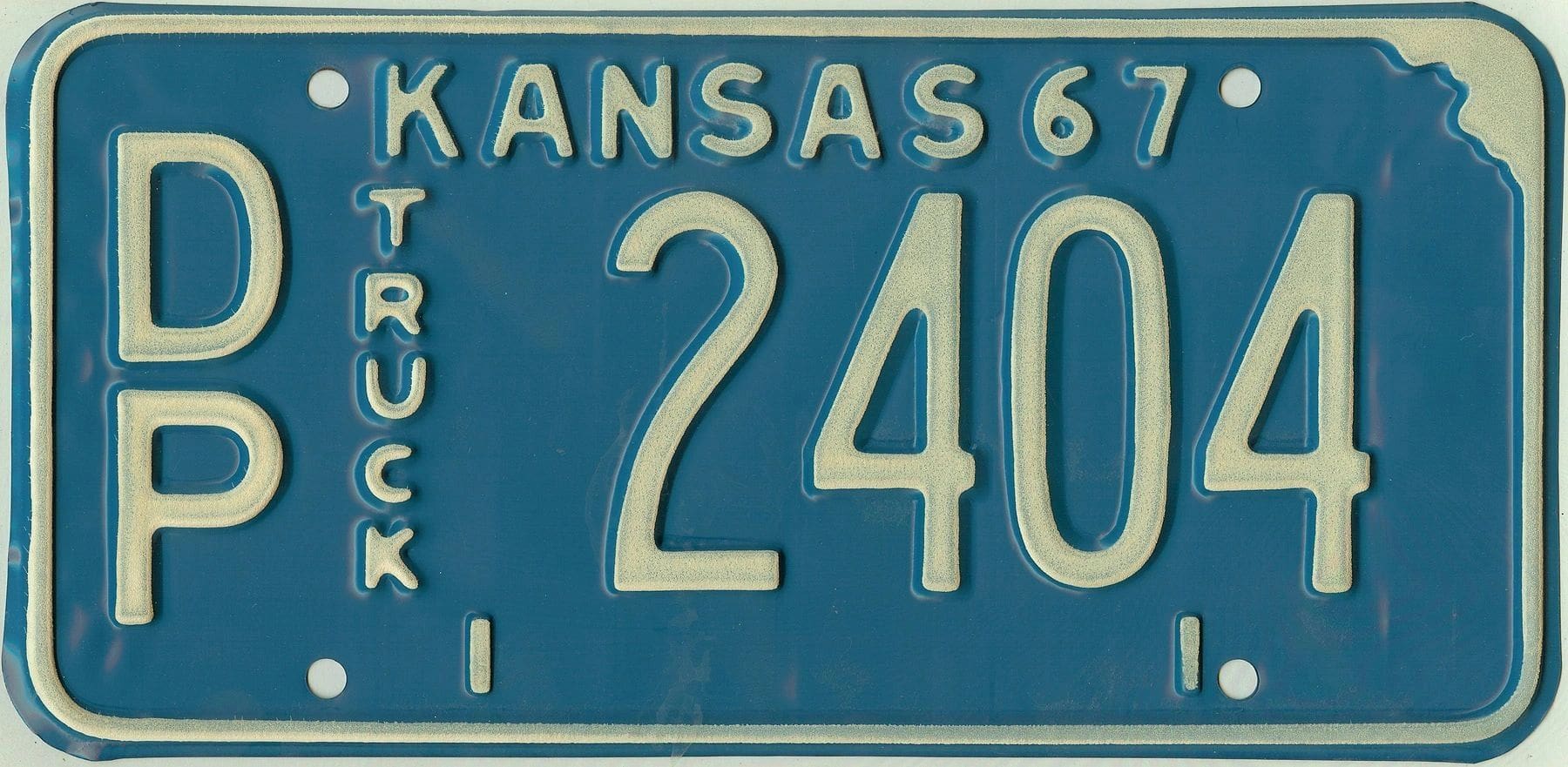 Kansas 1967 truck license plate Doniphan county #DP-2404. Plate is NOS. This plate number has been checked and it is clear to register to a vehicle.