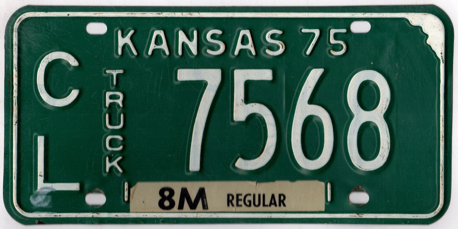 Kansas 1975 truck license plate Cowley county #CL-7568.