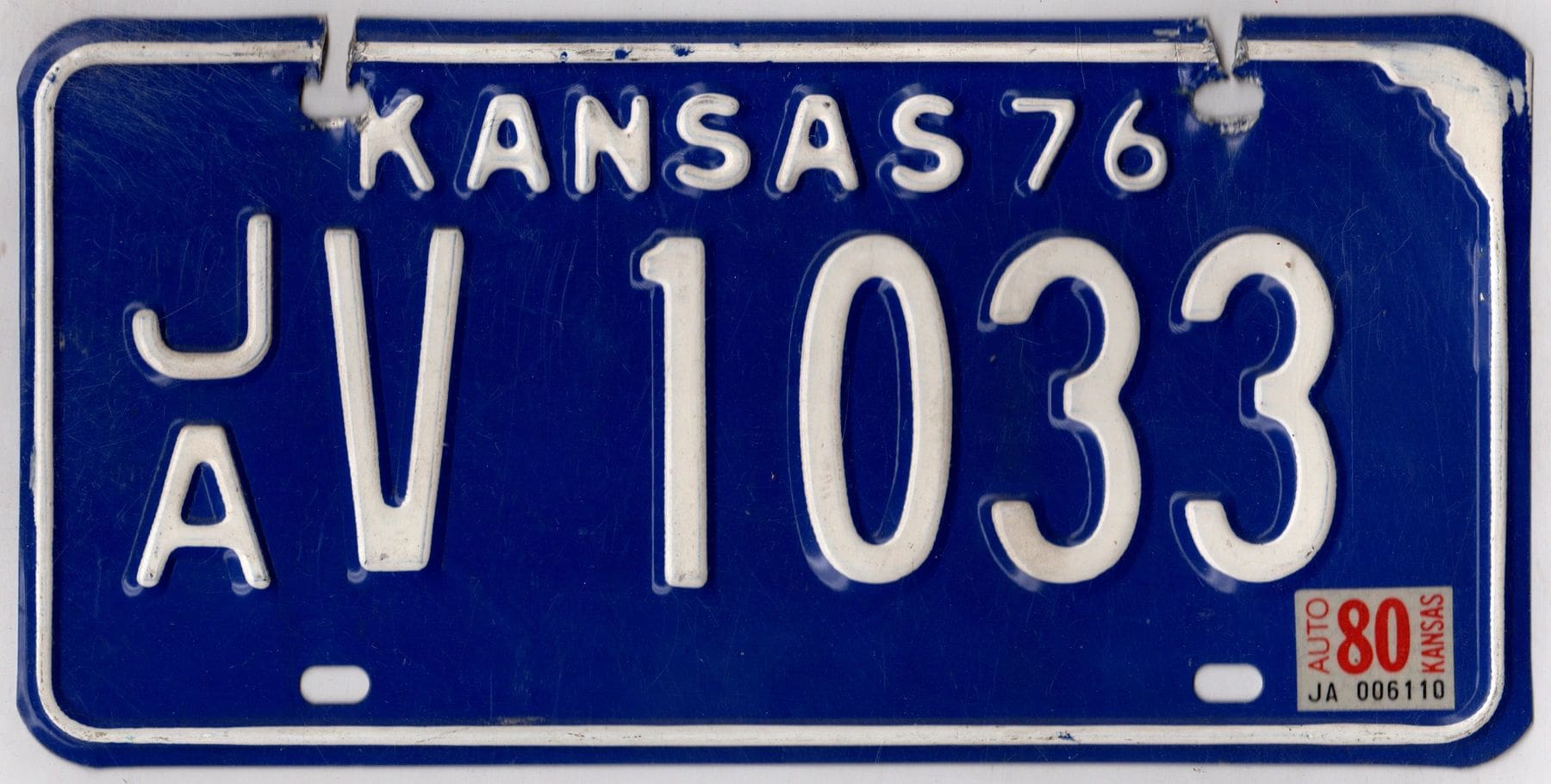 Kansas 1980 car license plate Jackson county #JA V-1033.