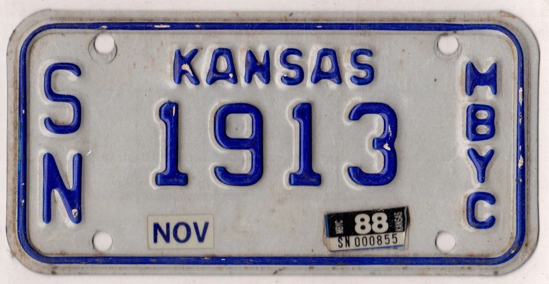 / Kansas 1988 MBYC (motorbicycle) license plate Shawnee county #SN-1913