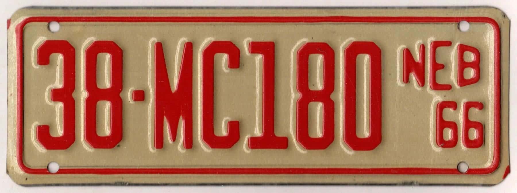 Nebraska 1966 motorcycle license plate Furnas county #38-MC180